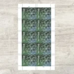 This attractive green stamp features a variety of geographic shapes, overlapping circles, ovals, and triangles, to create a floral, leaf-like pattern that mirrors the geometric shapes found in flowers and other plant life in the natural world. These stamps are printed using a foil technique that gives them a shiny, shimmering appearance.