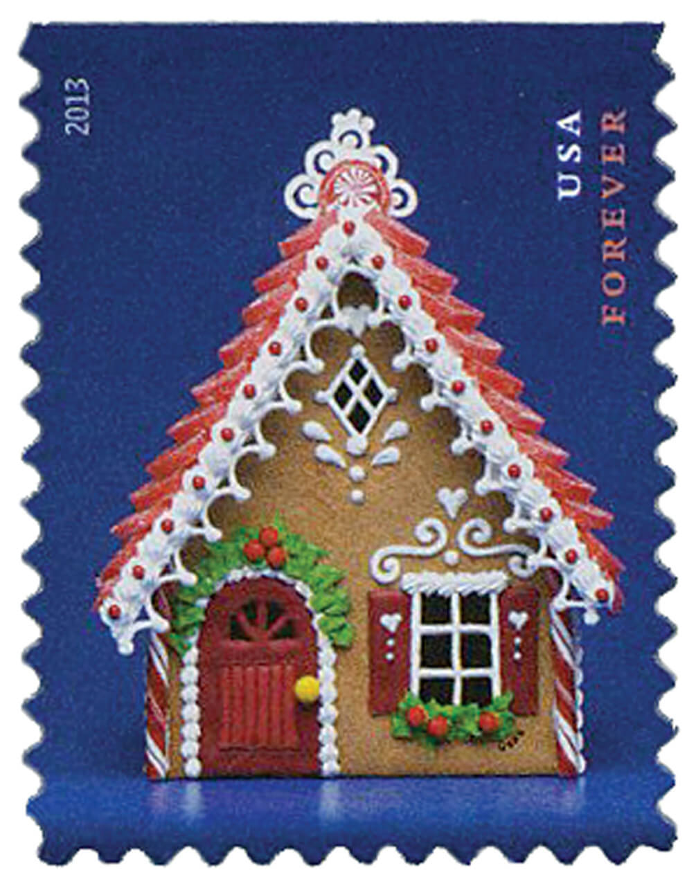 This stamp is part of a block of four issued for the 2013 holiday season. Designers constructed the gingerbread houses specifically for the stamp.