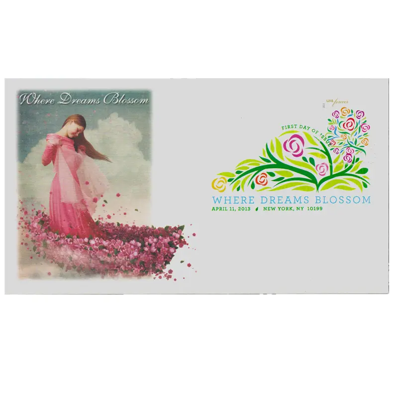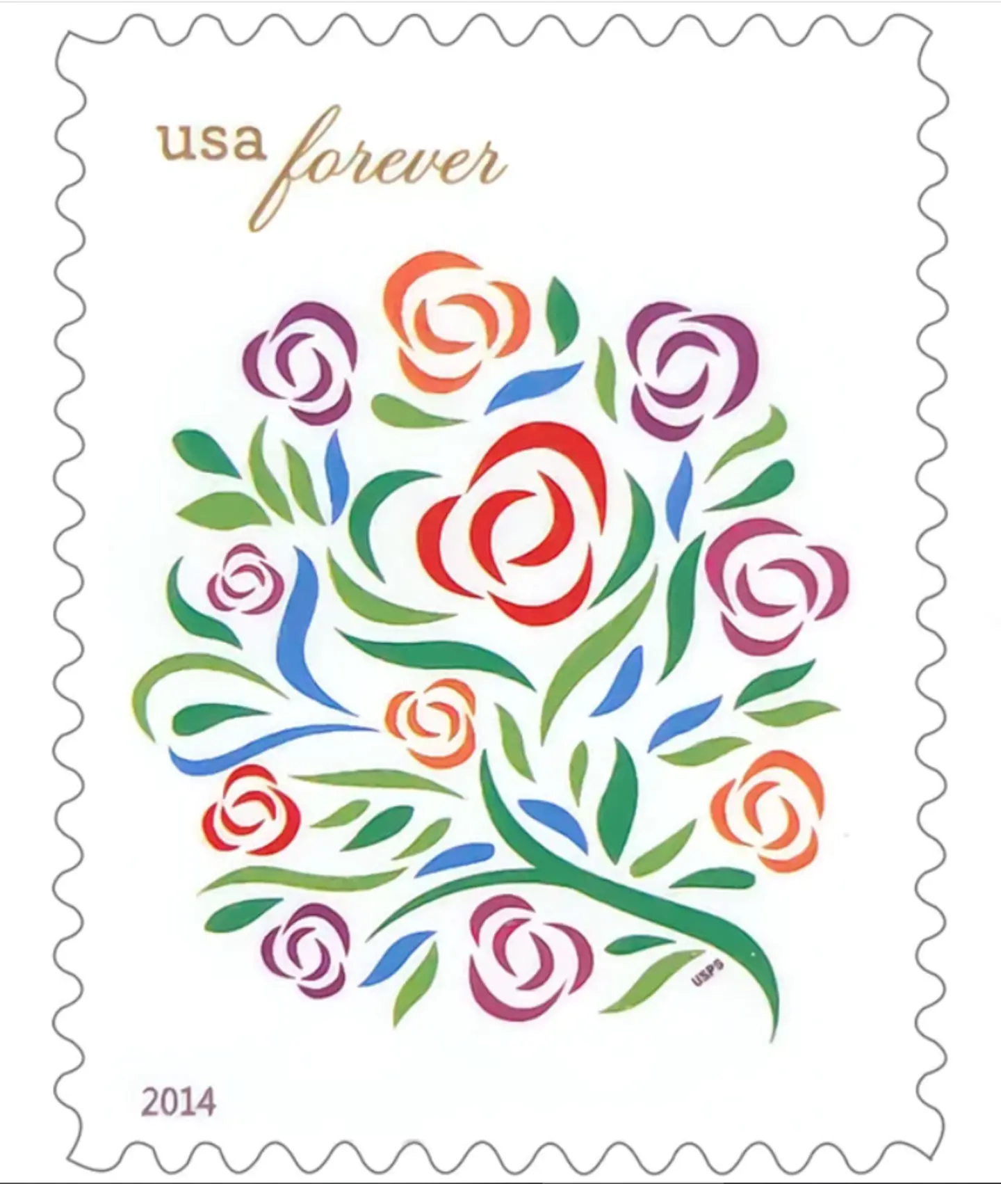 As with the “Yes I Do” Heart of Roses stamp, the “Where Dreams Blossom” Wedding Bouquet stamp was designed by Ethel Kessler using an illustration by Michael Osborne. This stylized bouquet stamp was issued for use on the save-the-date notices, response cards, and thank-you notes.