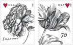 The rose was chosen for the 2015 Weddings Forever stamp because it is a universal symbol of love. This stamp was issued for use on wedding RSVP cards and thank you notes. A two-ounce rate Vintage Tulip stamp was released at the same time for use on wedding invitations and greeting cards that require extra postage.