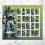 Go Beyond Set: Four different stamp designs were issued to coincide with the movie Lightyear’s release, each showcasing Buzz Lightyear in a different pose. All artwork is provided by Pixar Animation Studios. The selvage of the pane of 20 includes a full-body view of Buzz in his iconic green and silver space suit.