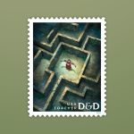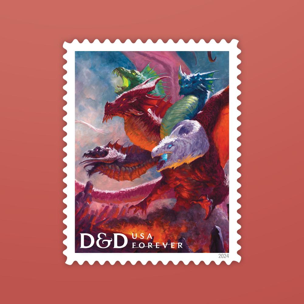 10 Forever stamps issued for the 50th anniversary of Dungeons & Dragons. They picture 10 different designs showcasing characters, creatures, and encounters from Dungeons & Dragons. The selvage of the pane of 20 pictures a party of adventurers fighting a dragon, a gold 20-sided die (d20), and an example of a Dungeons & Dragons map.