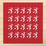 Geometic shapes come toaether to fomm the highly stvlized white bird, Set aoainst a rich red backaround. the bird caries in itsbeak a pink envelope sealed with a red heart.